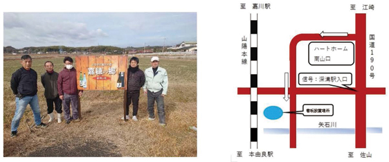 令和4年1月30日(日)に、多くの皆さんのお力を借りて、ふるさと嘉川の酒「嘉穂の郷」発祥の地に看板を設置することができました。