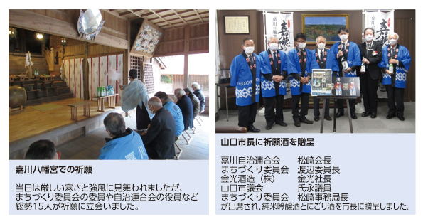 「嘉川のお米、嘉川の水、嘉川の酒造」で嘉川のお酒をつくりはじめて12年となりました。今年は初の試みとして、12月19日(日)に、新型コロナウイルスへの厄除けと、多くの方が健康で幸せな暮らしができるように、地元嘉川八幡宮で「嘉穂の郷」の祈願を行いました。