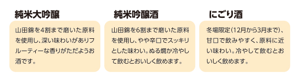 酒米の王者と称される嘉川産「山田錦」の原料に磨きをかけた、「純米大吟醸酒」、「純米吟醸酒」、「にごり酒」の3種類を2月1日(火)から販売します。